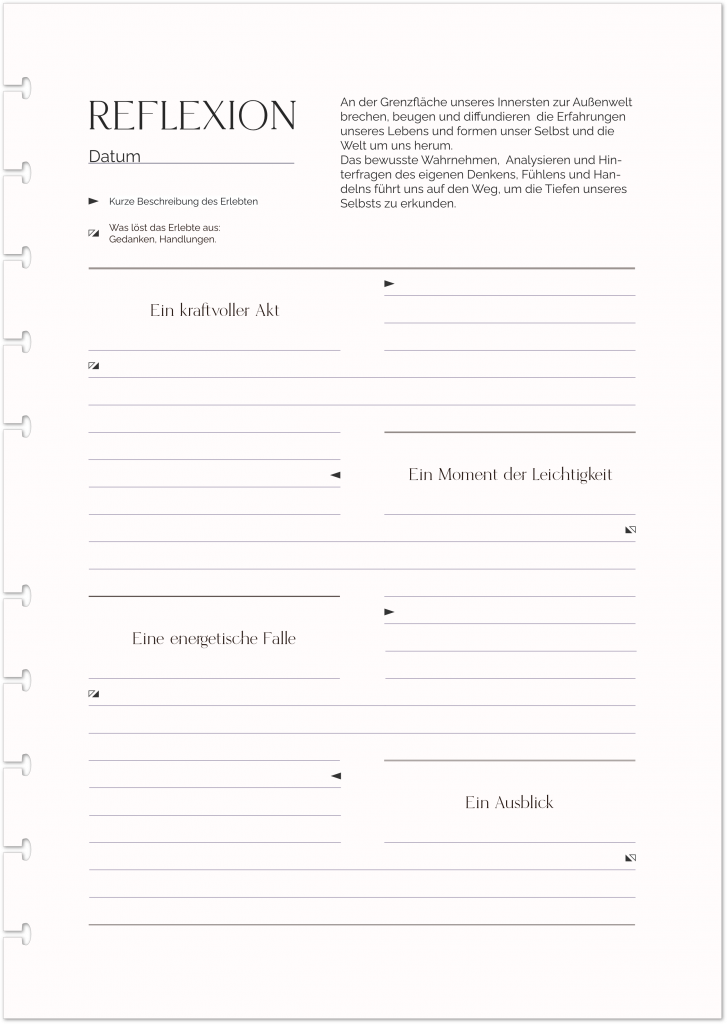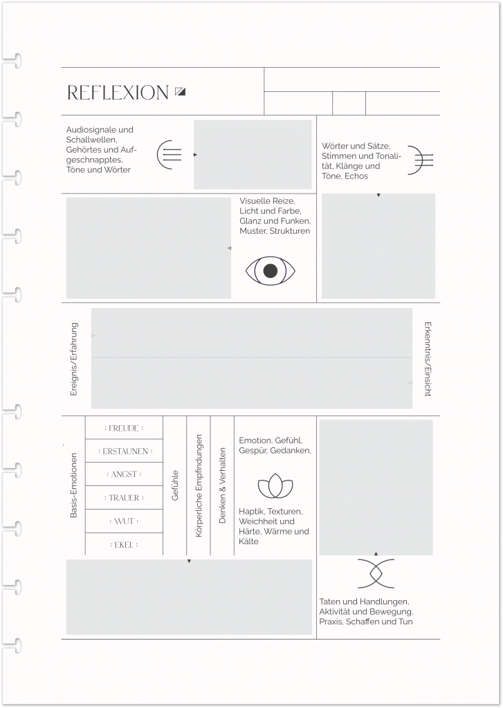 Die Designs in unserem Reflexionsmodul sind ein visueller Stimulus, um den Prozess des Denkens und Schreibens anzustoßen und zu kanalisieren. Reflexion dient dazu, die eigenen Gedanken, Erfahrungen und Lernprozesse festzuhalten, sie aus verschiedenen Blickwinkeln zu betrachten und für die Zukunft zu lernen.