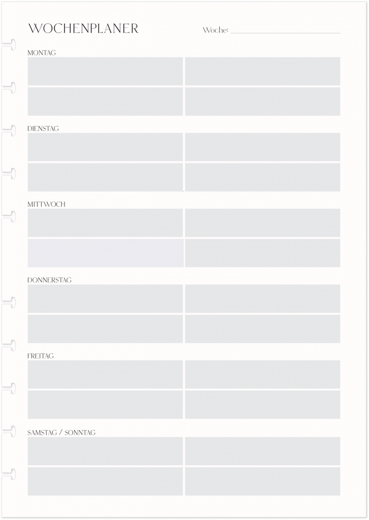 Die verschiedenen Wochenplaner sind ideal, um dir einen Überblick über alle anstehenden Termine zu geben. Durch die Lochung liegen die Wochenplaner im aufgeschlagenem Journal auf der rechten Seite. Die Rückseite bietet dir eine Inbox im Eisenhower-Matrix-Stil, alle neuen Aufgaben oder Themen der Woche kannst du hier sofort nach Wichtigkeit und Dringlichkeit einsortieren. Das hilft dir, dich auf die wichtigen und dringenden Themen zu fokussieren.