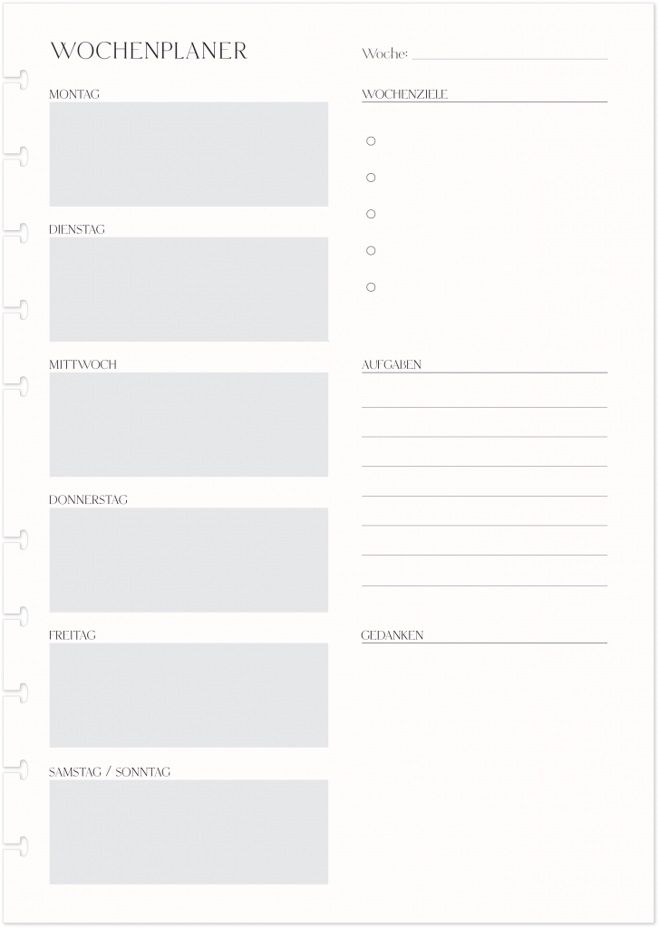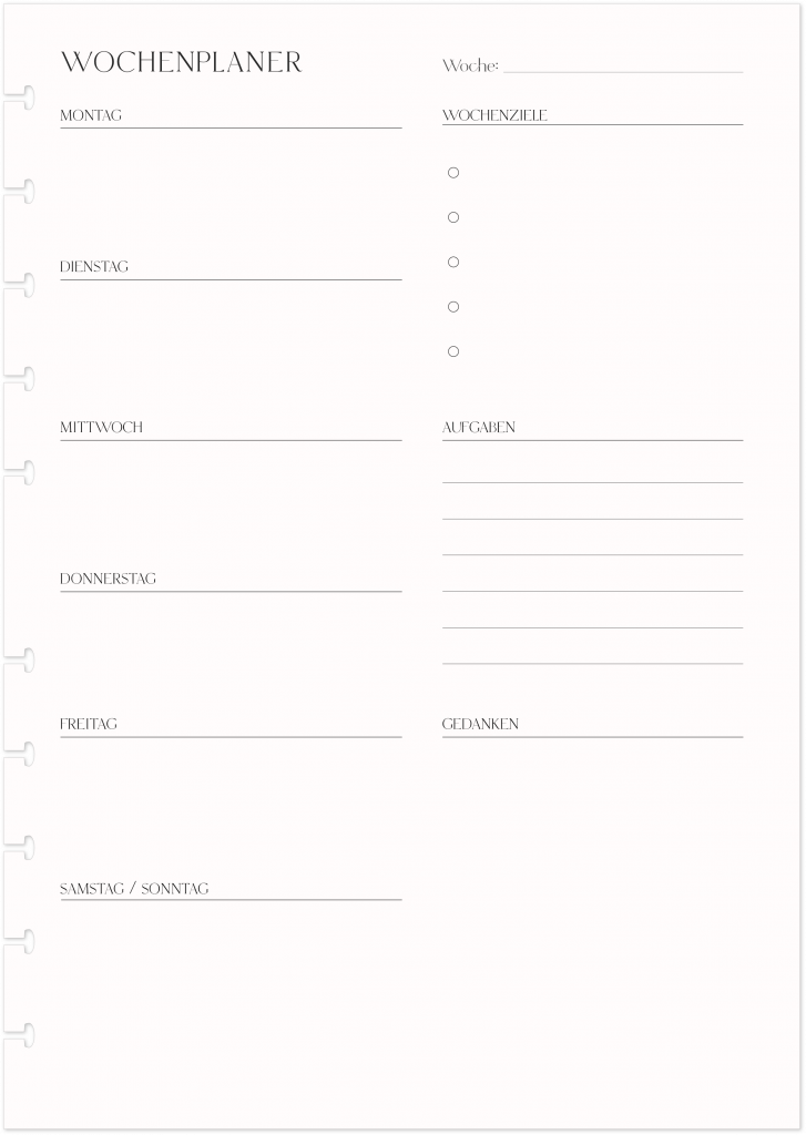 Mit den Wochenplanern kannst du alle unmittelbar anstehenden Termine erfassen. Er bietet dir Platz um Wochenziele und Aufgaben zu notieren. Die Inbox auf der Rückseite is im Stil einer Eisenhower-Matrix gestaltet, alle neuen Aufgaben oder Themen der Woche kannst du hier sofort einsortieren.